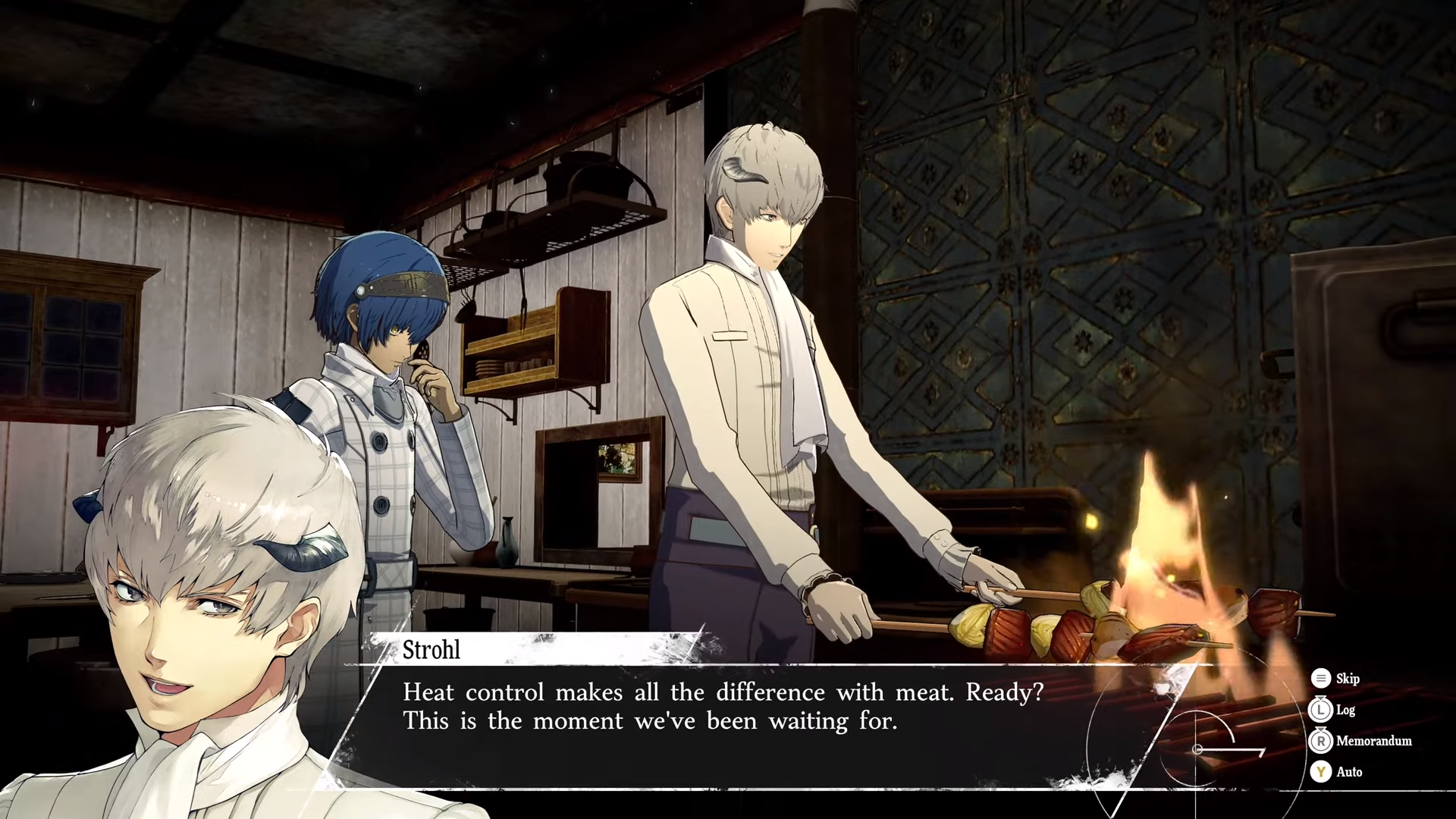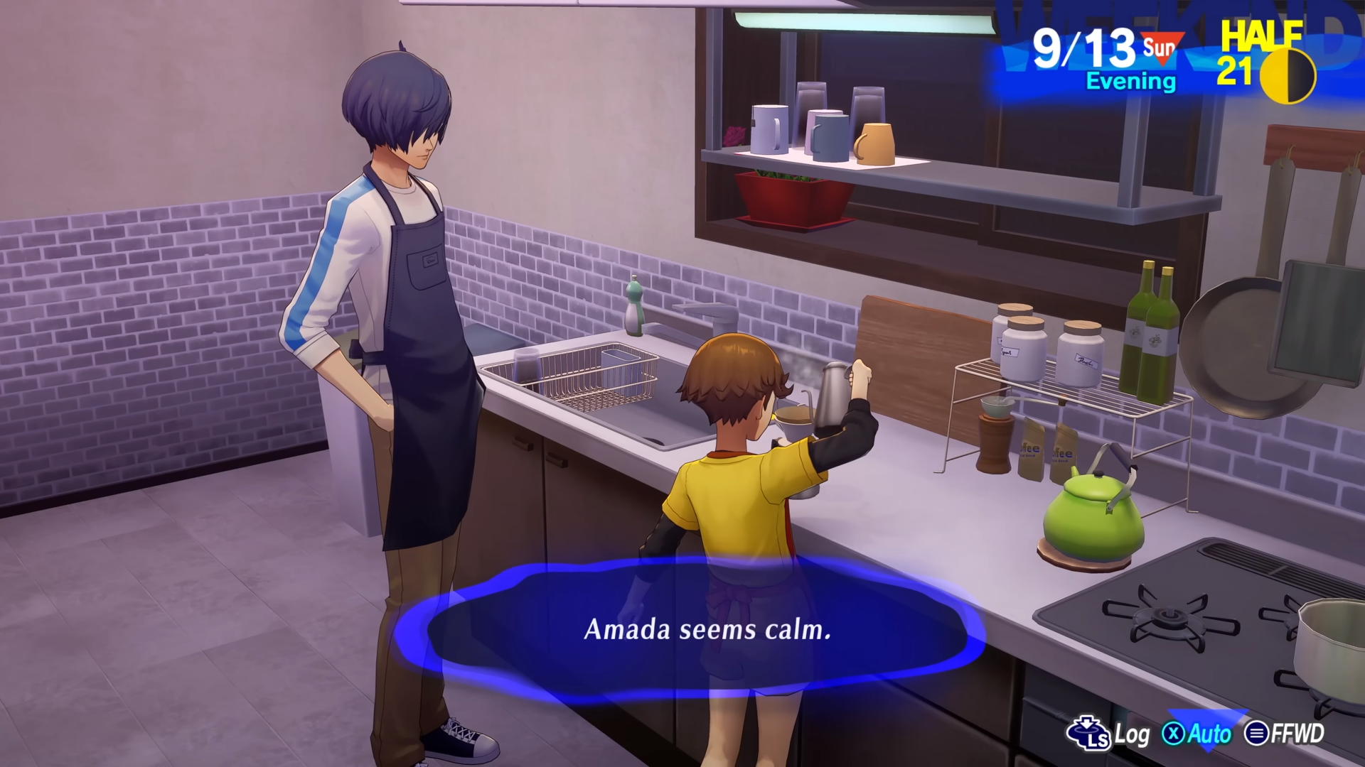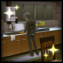 In Reload, the activity has been rehashed: starting from June 16th, the protagonist can spend time cooking or brewing together with various SEES members in the Iwatodai Dormitory as long as they're available to perform that specific activity. The protagonist can only cook with Yukari Takeba, Mitsuru Kirijo, Akihiko Sanada, Ken Amada and Shinjiro Aragaki.