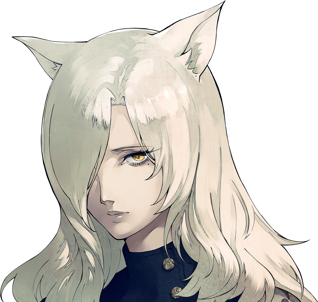 Fabienne is a tall, beautiful and shapely woman with golden eyes, waist-length silver hair and bangs covering one side of her face. As a paripus, she has several animal-like characteristics, namely a pair of cat ears and a silver fox tail. Her attire consists of a dark blue dress that extends down to her knees, dark green leggings, black heels, and embroidered sleeves with a floral and vine pattern.