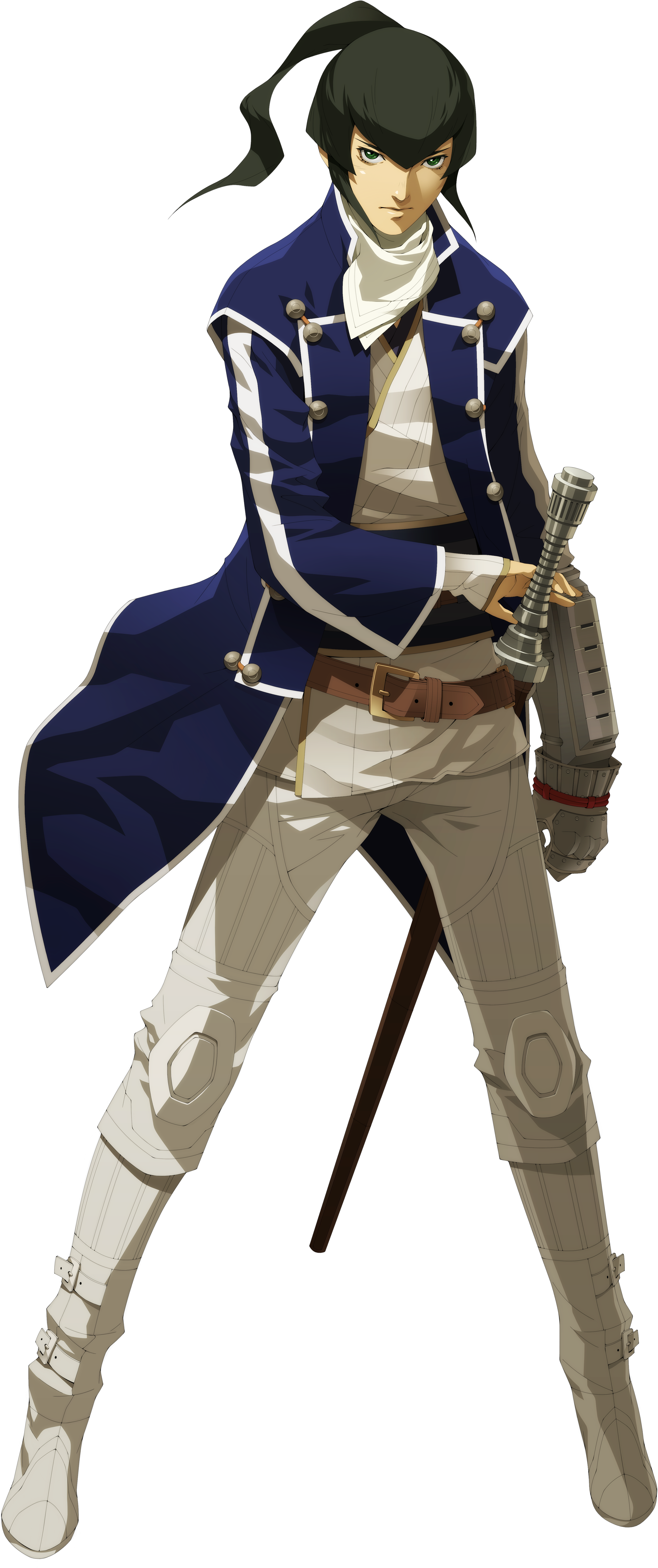 Flynn has long dark hair in a ponytail, sharp green eyes and slightly tanned skin. He wields a COMP, in the form of a gray gauntlet, a katana and wears his samurai uniform, which consists of a dark navy blue jacket with white stripes, a light top, a brown belt, white pants with shin guards and white boots. He also has a white scarf. While his field model changes according to the equipment he is wearing, he appears in his samurai uniform during animated cutscenes.