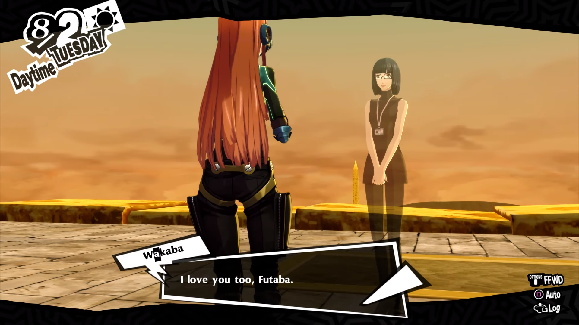 Futaba enjoys tricking Aigis into behaving in inappropriate or informal manners, as Aigis is extremely suggestible and oblivious to it, to the point that she manages to carry Futaba's mannerisms into reality at the epilogue.