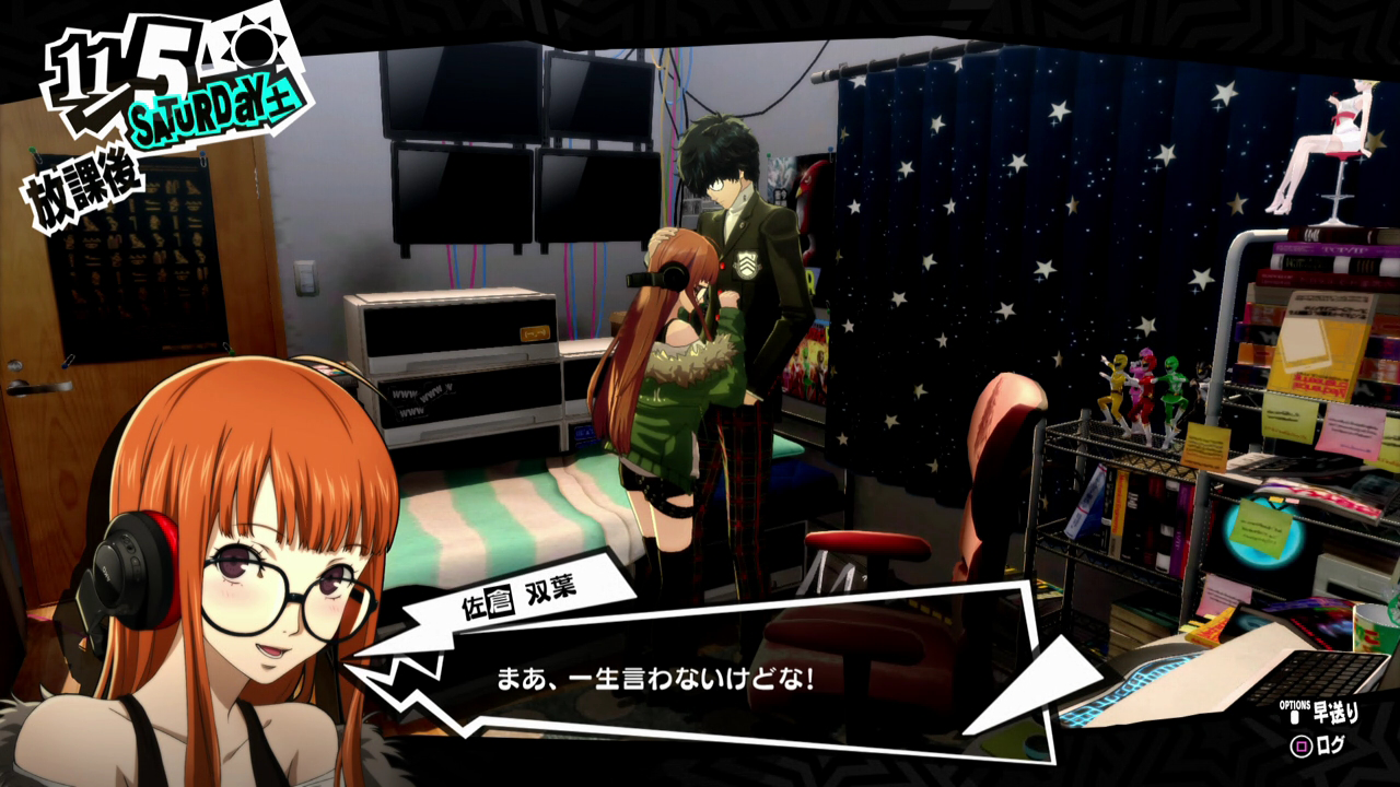 To soothe her guilt, she tracks down Kana and discovers that the abuse has not stopped. Futaba was then entrusted with the task of stealing her parent's hearts so she can live a normal life again. After Kana and Futaba reconnect, they rebuild their friendship, and both girls resolve to attend school again. At that point, the protagonist can choose to start a romantic relationship with her or not. If they do, Futaba goes out and buys a figure on her own as proof of her independence. If they do not, she spends close to an hour exploring Akihabara on her own. Either way, she thanks the protagonist for giving her something irreplaceable: her life back. Her newfound strength and independence causes Necronomicon to transform into Prometheus.