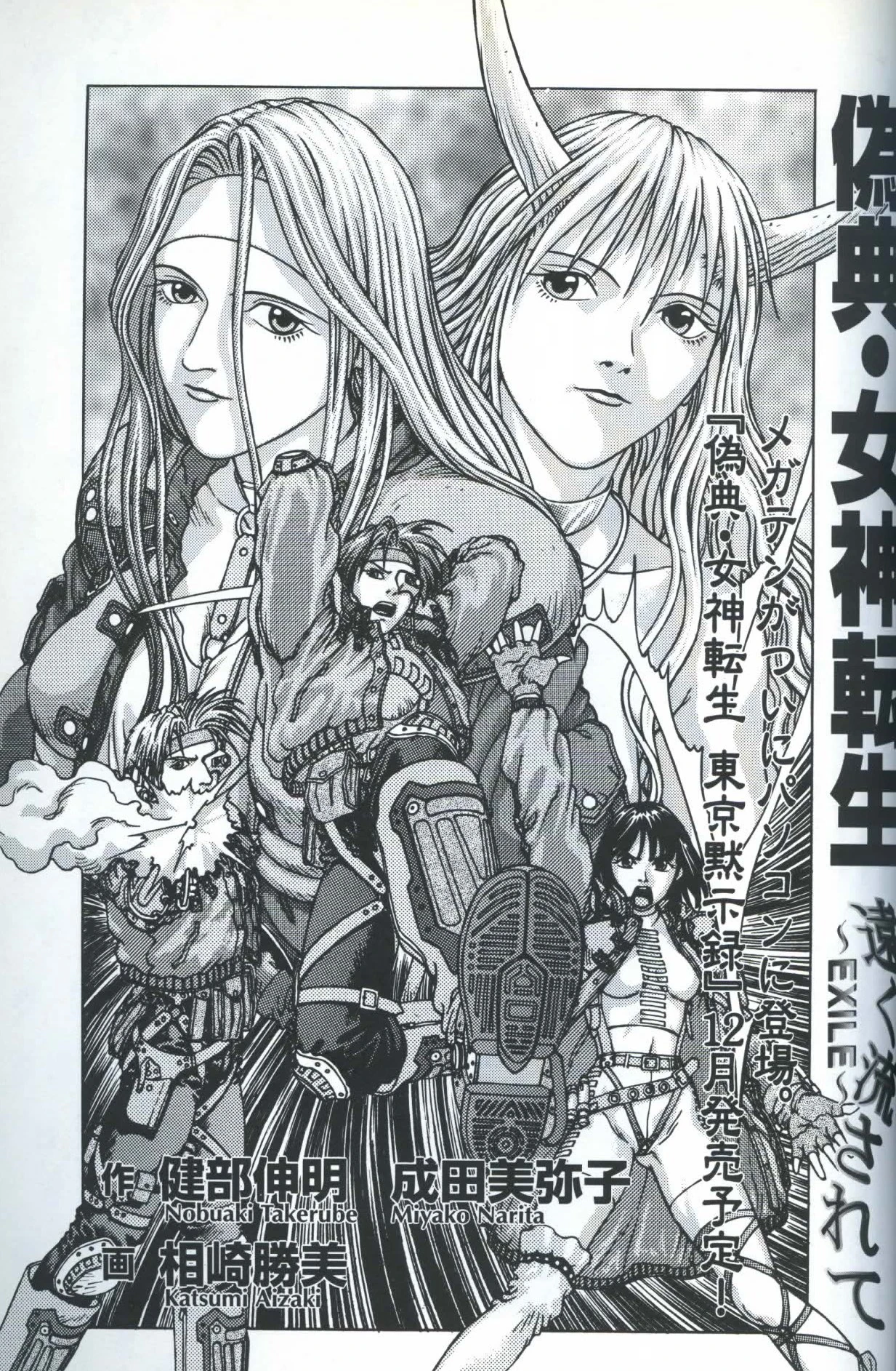 Giten Megami Tensei: Distant Flow ~EXILE~ is a novelized version of the introduction to Giten Megami Tensei: Tokyo Mokushiroku written by Takerube Nobuaki and Narita Miyako, with original art by Miyajima Katsumi, which was published in a December issue of TRPG's Logout in 1995. The character names and development differ somewhat from those used in the game.