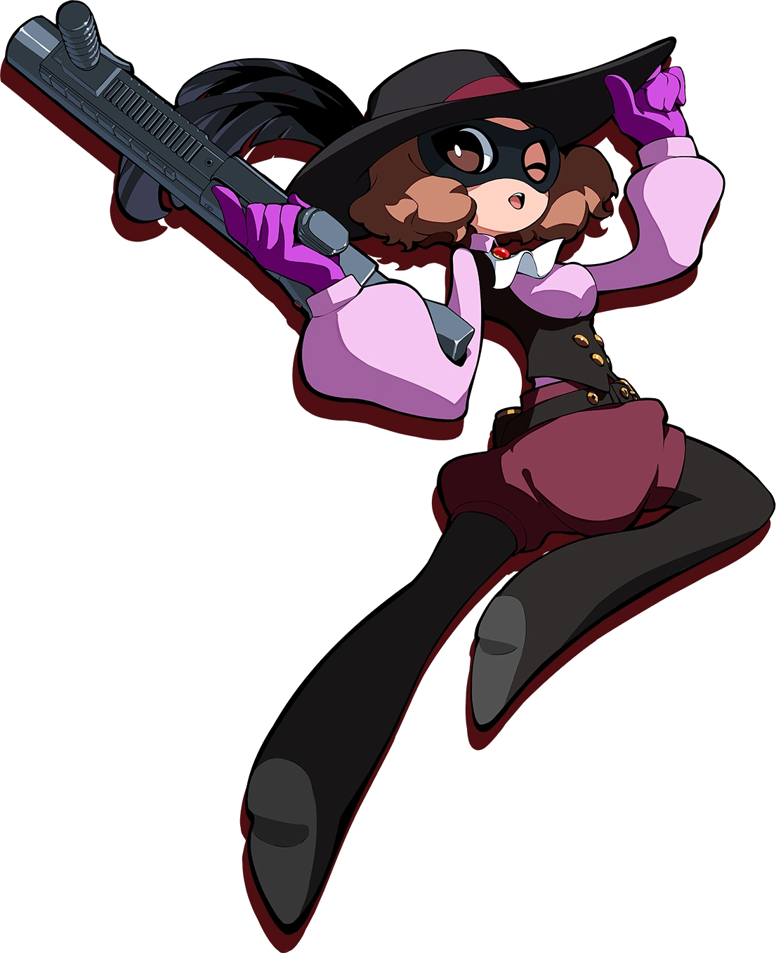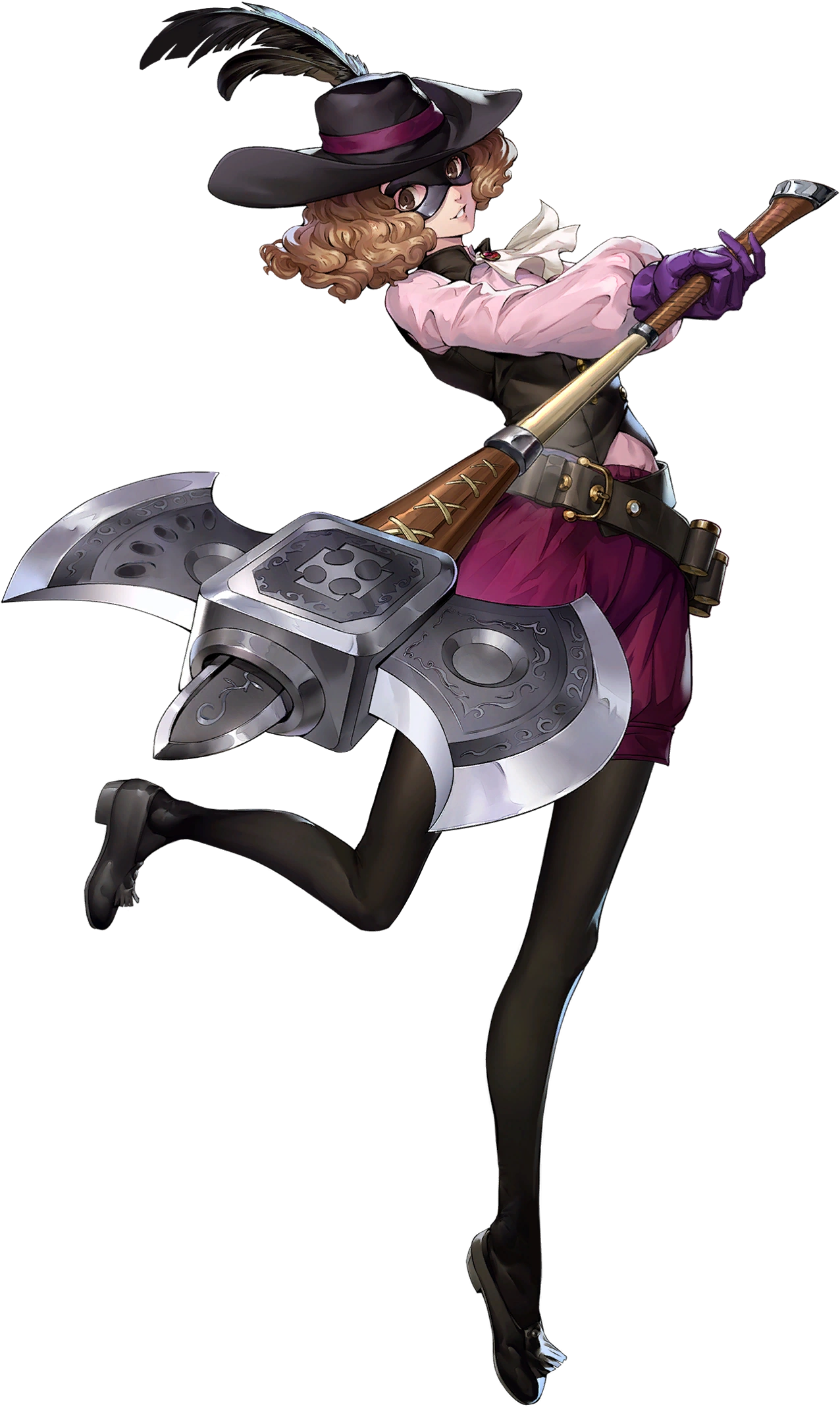 Her Phantom Thief outfit consists of a dark purple cavalier hat with a feather plume tucked into a royal purple hatband, a long-sleeved pale pink blouse with a white neck jabot (held there by a red gem pin), a black corset vest with gold buttons, bloomers that match her hatband, black pantyhose, a holster belt carrying ammo and lace-up pumps. Her mask and gloves are black and violet, respectively.