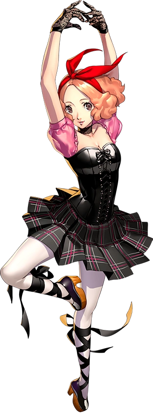 In Persona 5: Dancing in Starlight, her outfit resembles that of a ballerina. It consists of a black corset with puffy bright pink short transparent sleeves, a white tutu under her Shujin Academy skirt, white tights and black ballet shoes with heels. She also wears black lace gloves with a matching choker and a red ribbon tied on top of her head.