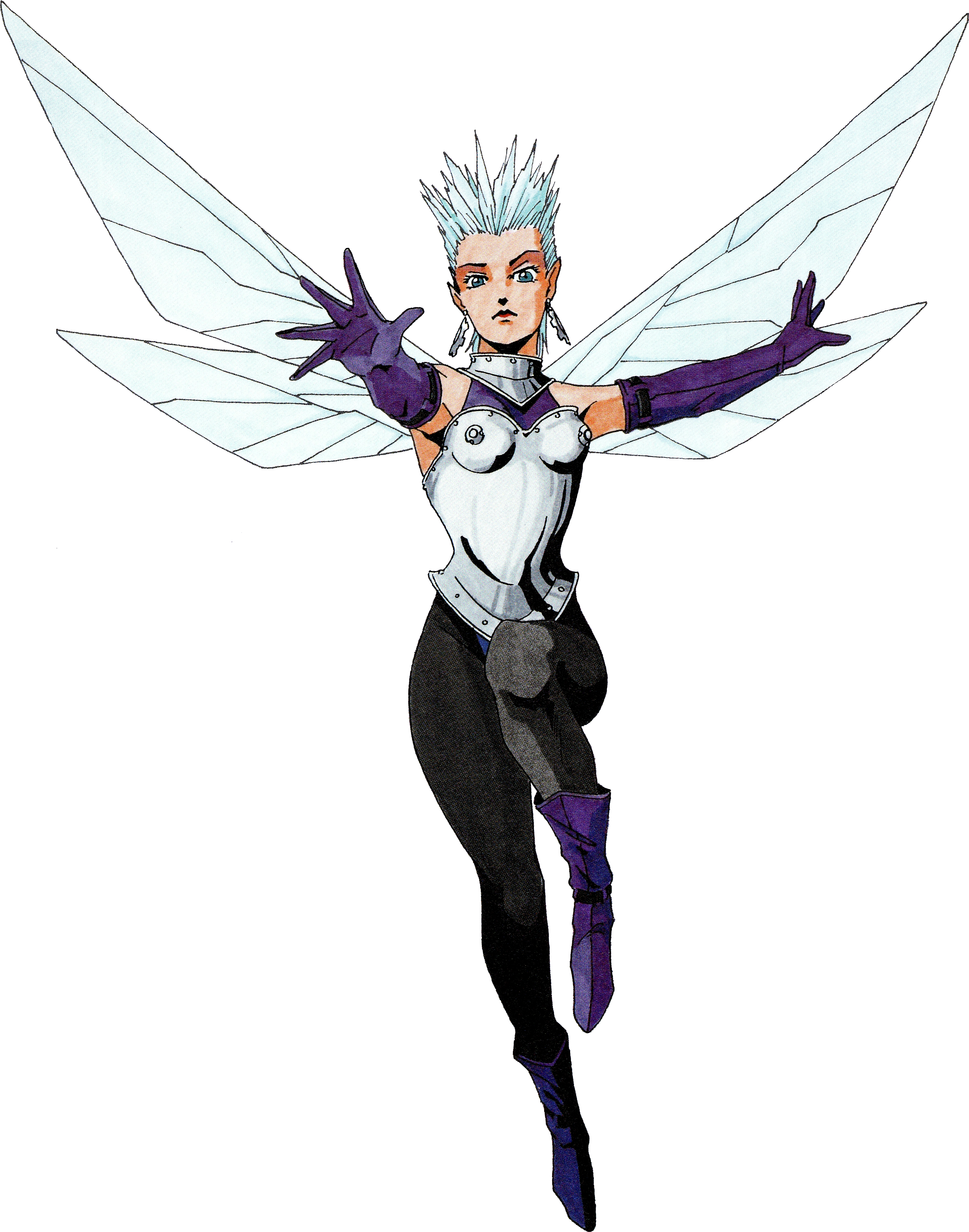 In Shin Megami Tensei II: Akuma Daishiten (Demonic Encyclopaedia), series artist Kazuma Kaneko has explained the upright spiked hairstyle of High Pixie is purposed to render the word, high.