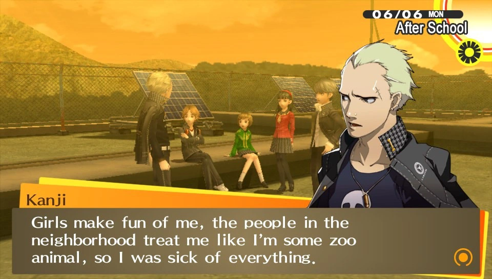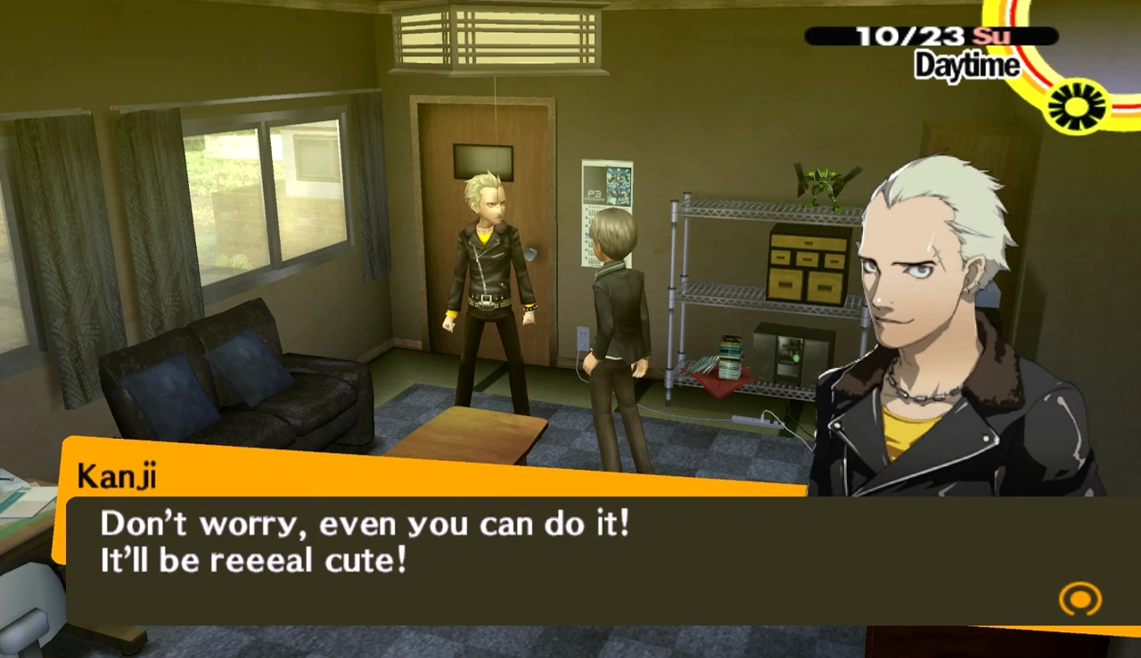 Even after his friends have accepted his long-standing inner conflicts, his likes and hobbies, and the him who represents all those things, he still feels unsettled at times. By the end of the game, Kanji acknowledges a deeper acceptance and understanding of stereotypically "feminine" and "masculine" interests in his Social Link.
