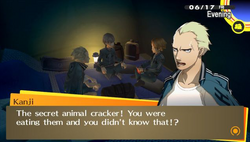 In addition to that, in a Social Link event with Naoki Konishi, it was revealed that the "super yummy croquettes Kanji's mom made" he had 10 years ago were actually made by Kanji himself when he was young. In other words, not only is Kanji good at crafts and sewing, he's also a decent cook. On his online profile, he is part of the social group "Delicious Shops In Inaba." He is a huge fan of popsicles and animal crackers, and is searching for the ultimate secret animal cracker: the penguin.