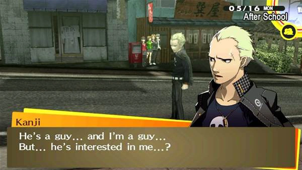 Kanji is terrified of having the secrets he has kept for so long, his likes and his true nature, revealed and he suspects that he really does have a "feminine" heart. As a result, on the other side of the TV, a dazzling world of love between men was created. Shadow Kanji claims that he hated women because they spoke behind his back, and that men would keep their feminine interests. Kanji did admit that it was saying the real thing. However, this can be just be interpenetrated as his feminine side taken to logical extremes. Kanji's real sexuality is left ambiguous, since he did mistake Naoto's "interest in him" (which is actually her suspecting that he might be the next victim of the serial murders) as a love confession, and Naoto had not been revealed as a woman during that time.