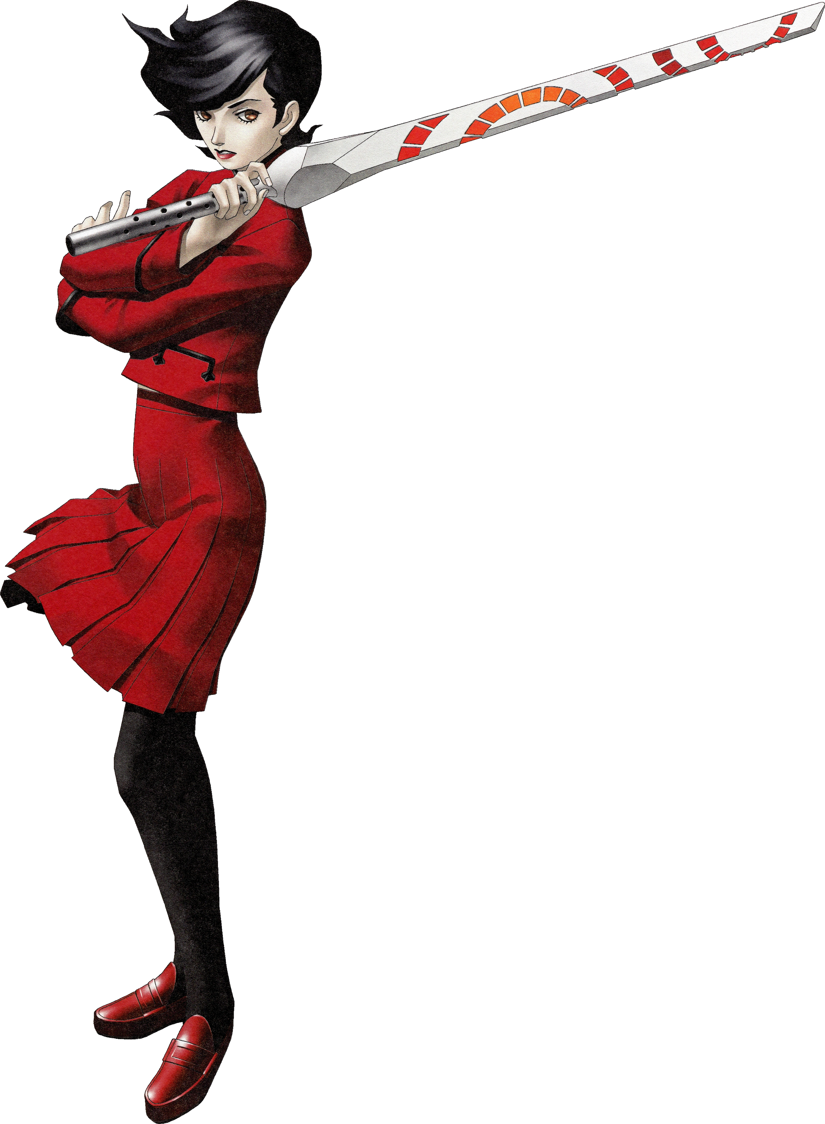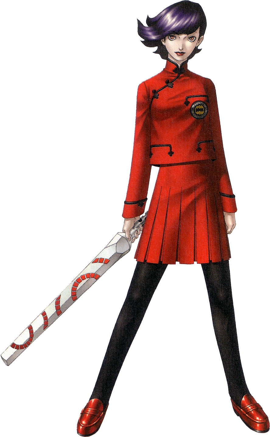 Kei is a teenage girl with brown eyes who wears a red top and skirt with matching red shoes and black stockings. Her hair flows to the right, and is colored dark purple in artwork for Maken X and in-game for both versions or black in Maken Shao's artwork.