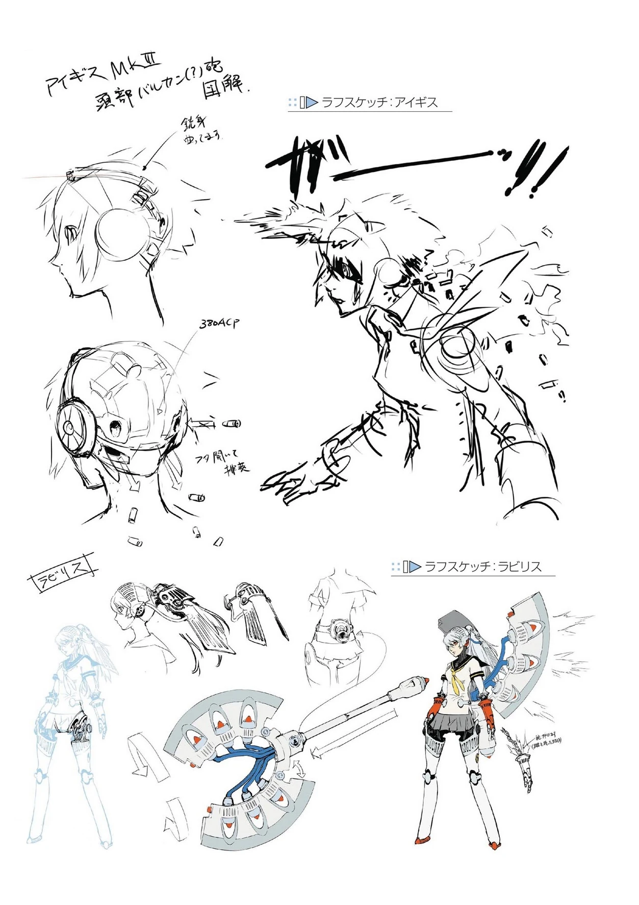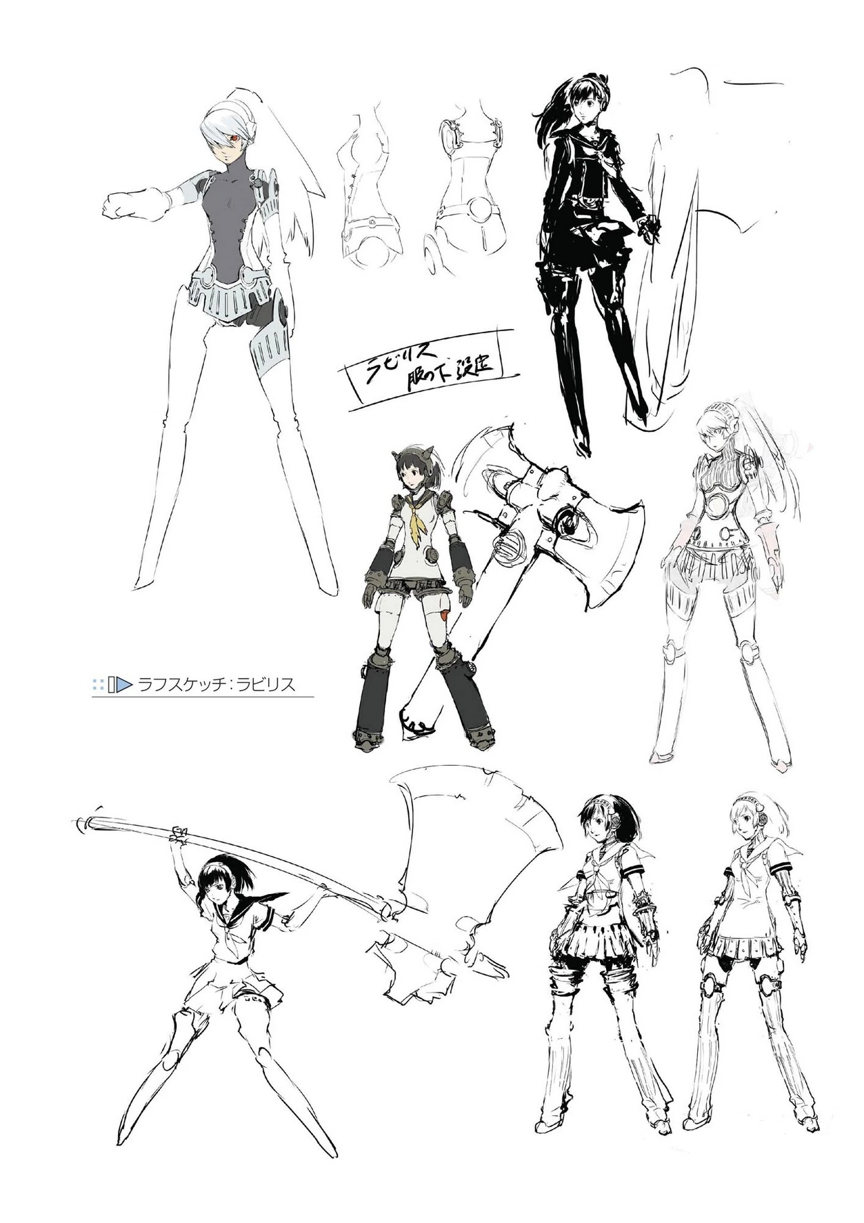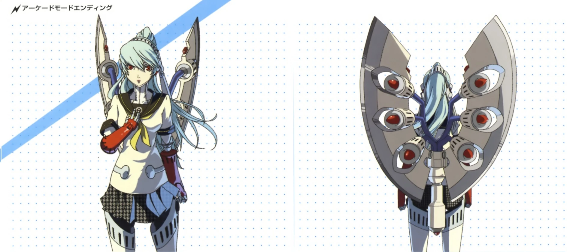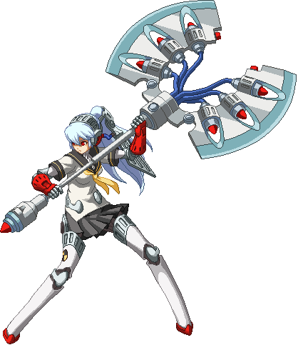 Labrys is a mechanical maiden with pale skin, blueish gray hair and piercing red eyes similar to Metis, dressed in Yasogami High's summer uniform which covers some parts of her mechanical body. One of the most interesting features about her design is her head piece which resembles a medieval helmet. There is also the large battle axe which also double as attachable-thrusters to allow her to fly. The thrusters on the axe are propelled independently to give extra controllable momentum to her swings.