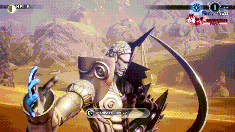 Madness Glint deals 2-5 hits of medium Almighty damage to random foes and may inflict Seal. When used by the enemy, it also has a chance of inflicting Confusion.