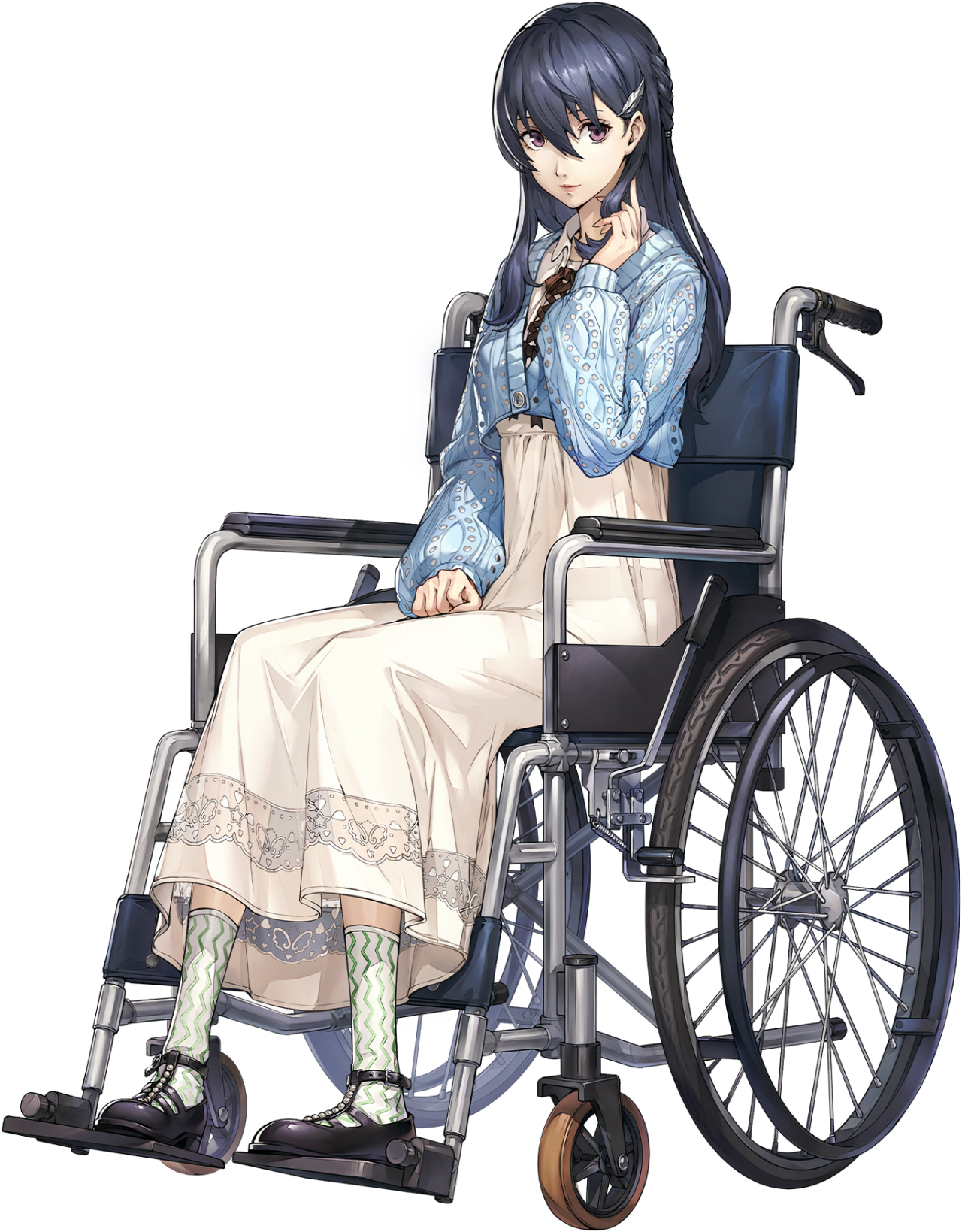 Manaka has pale skin, shoulder length black hair with a feather shaped hair clip on the left side and pale purple eyes. She wears a short, blue cardigan over a white dress with a black ribbon fastening the bodice with lace above the hem, white socks with green zigzag stripes and shoes with many open panels. She uses a wheelchair in the initial Synergy Rank.