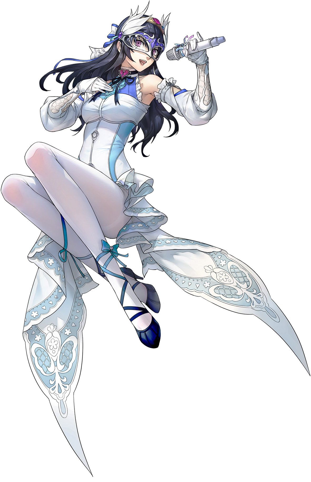 Ange wears a tiara with a round purple gem on the crown of her head, a mask with a blue part above her brow, feathery tufts at the sides secured with round gems a different shade of purple and a blue and white ribbon at the back of her head. Her dress has a white collar with a black stripe in the middle, a heart shaped gem, detached sleeves, a blue bodice, a silver button, white tights, black high-heels and white lacy tails. She holds a white microphone.