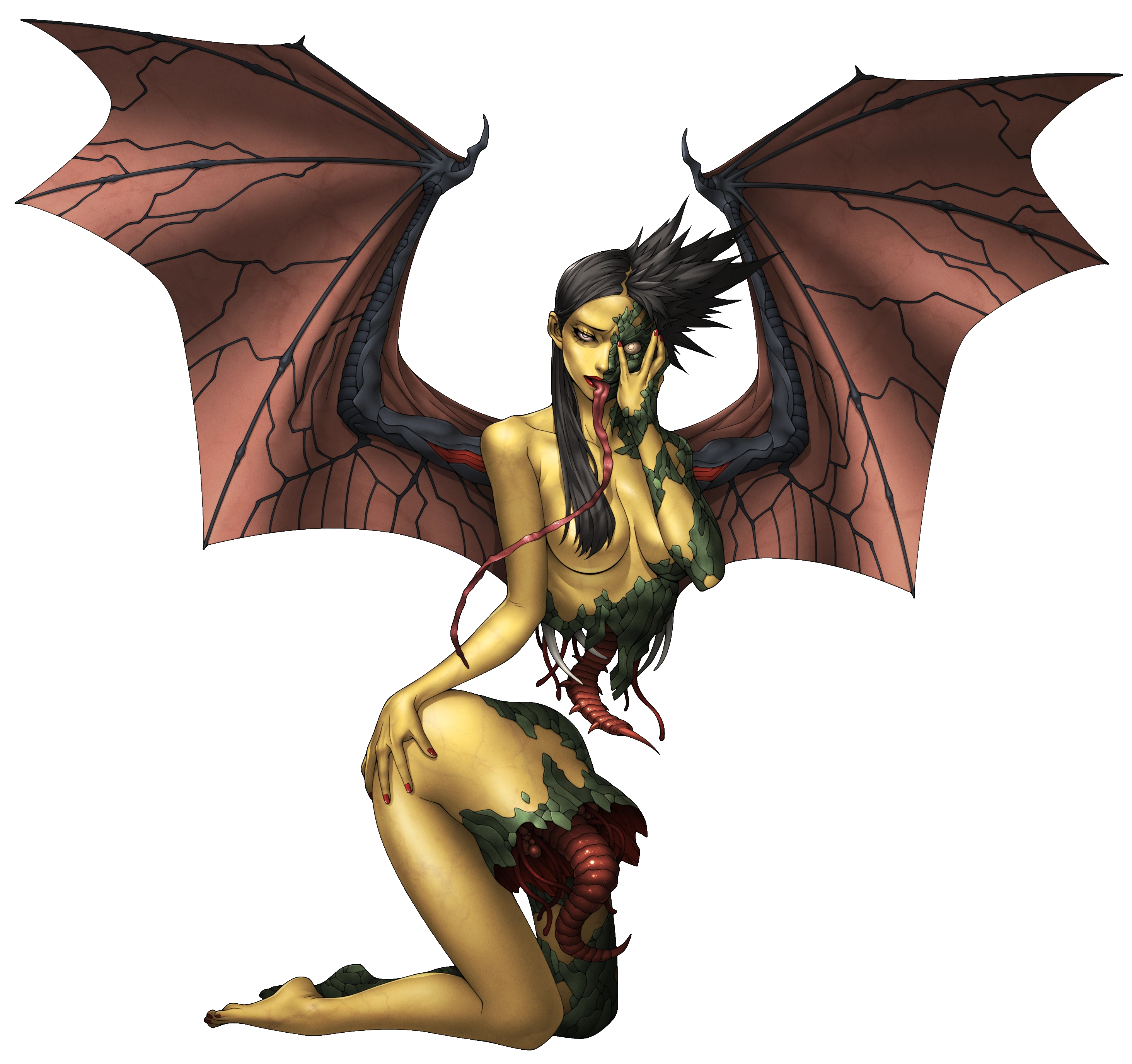 "A witch whose lore originated in the Philippines. It masquerades as a beautiful woman during the day but transforms into a blood-sucking monster at night. It has the ability to separate its upper and lower body, and can sprout bat wings from its back to fly in search of humans to suck their blood. It is said that the Manananggal preys on unborn fetuses in particular, using its proboscis-like tongue to open the wombs of pregnant women, wherein it will suck the fetus' blood, or devour it outright."