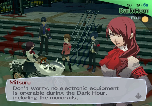 Mitsuru leading SEES, on her motorbike which can function in the Dark Hour.