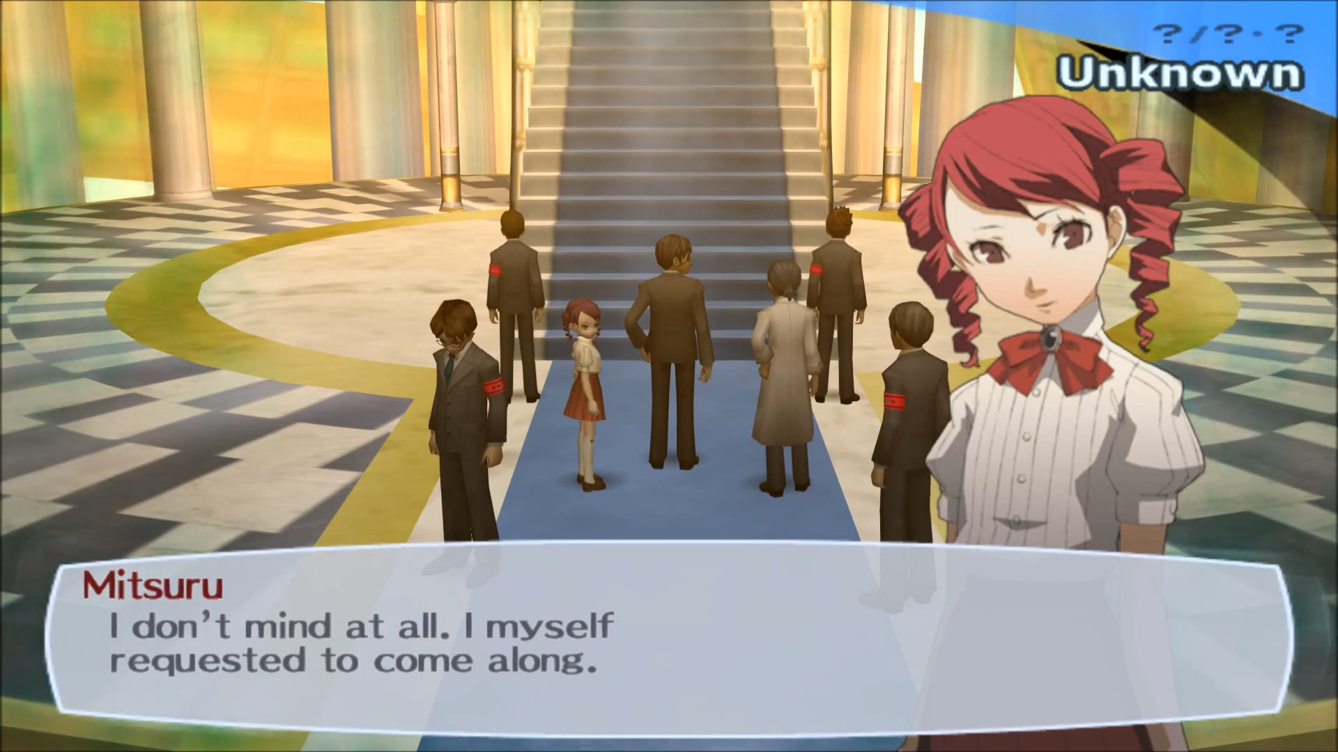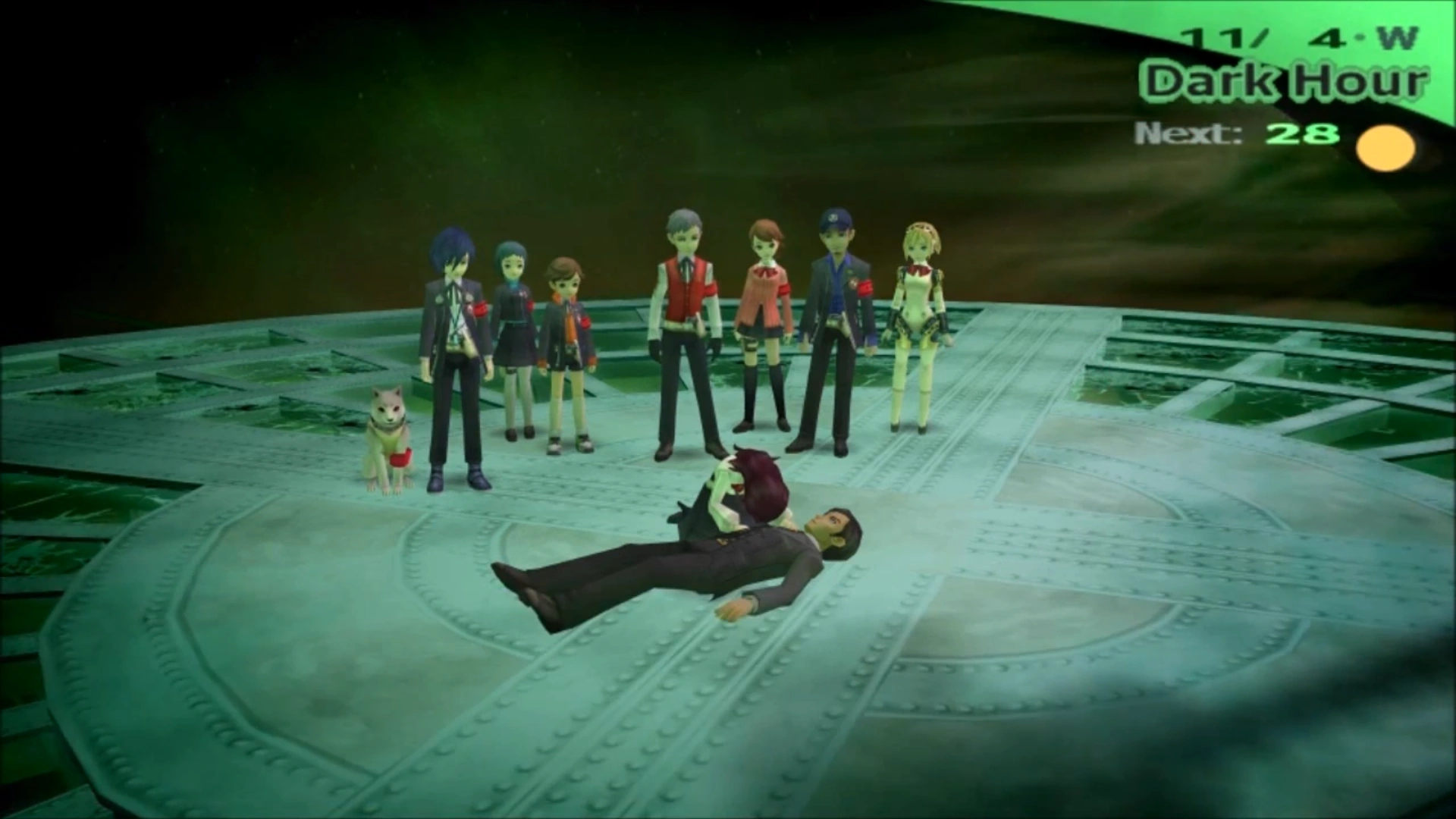 After defeating Nyx Avatar, the party would forget their memories of the Dark Hour and their bonds together. Mitsuru, in charge of the school's graduation ceremony speech, would mention her father having died from sudden illness, subconsciously noticing a contradiction. Mitsuru's strong will and reluctance to forget what happened to her father overpowers the memory erasure caused by the Dark Hour ending, causing everyone else to remember their promise they made with the protagonist. They run out of the auditorium and to the roof to reunite with him.