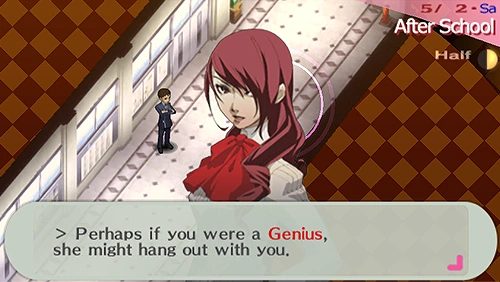 The protagonist is unable to begin Mitsuru's Social Link because she isn't a genius yet.