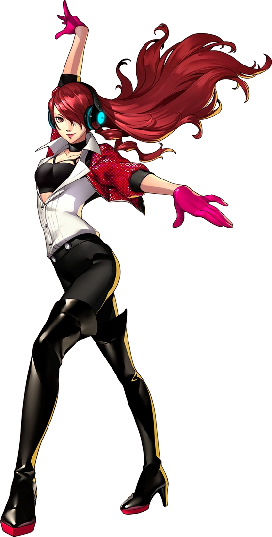 In Persona 3: Dancing in Moonlight, she retains some parts of her school uniform, although her blouse is left open, showing her strappy black sports bra beneath, and this is matched with a maroon short jacket, leggings and black thigh high boots. In addition, she also wears a black choker, magenta gloves, and a pair of black headphones.