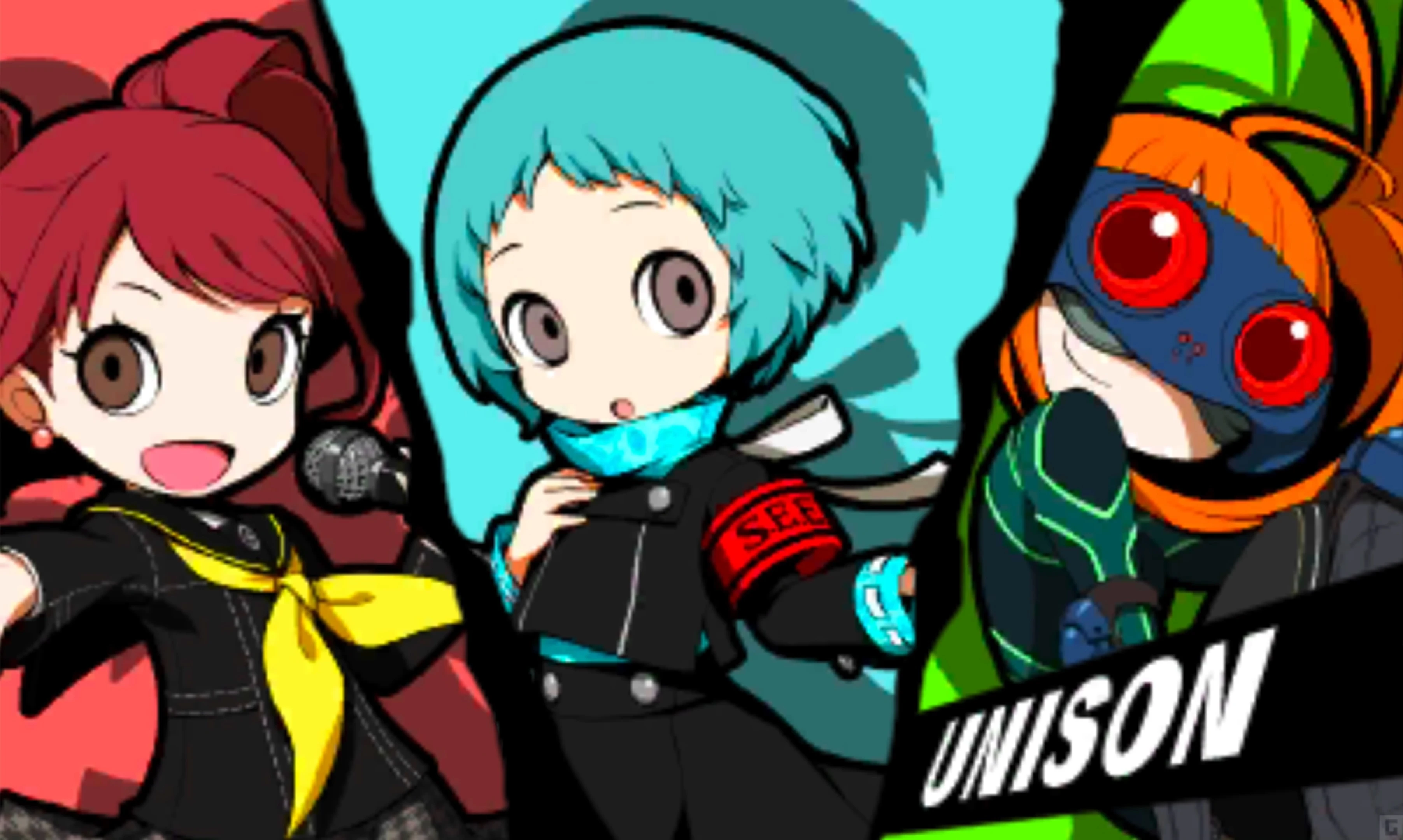 From left to right, the main Navigators of Persona 4, Persona 3, and Persona 5 in Persona Q2: New Cinema Labyrinth