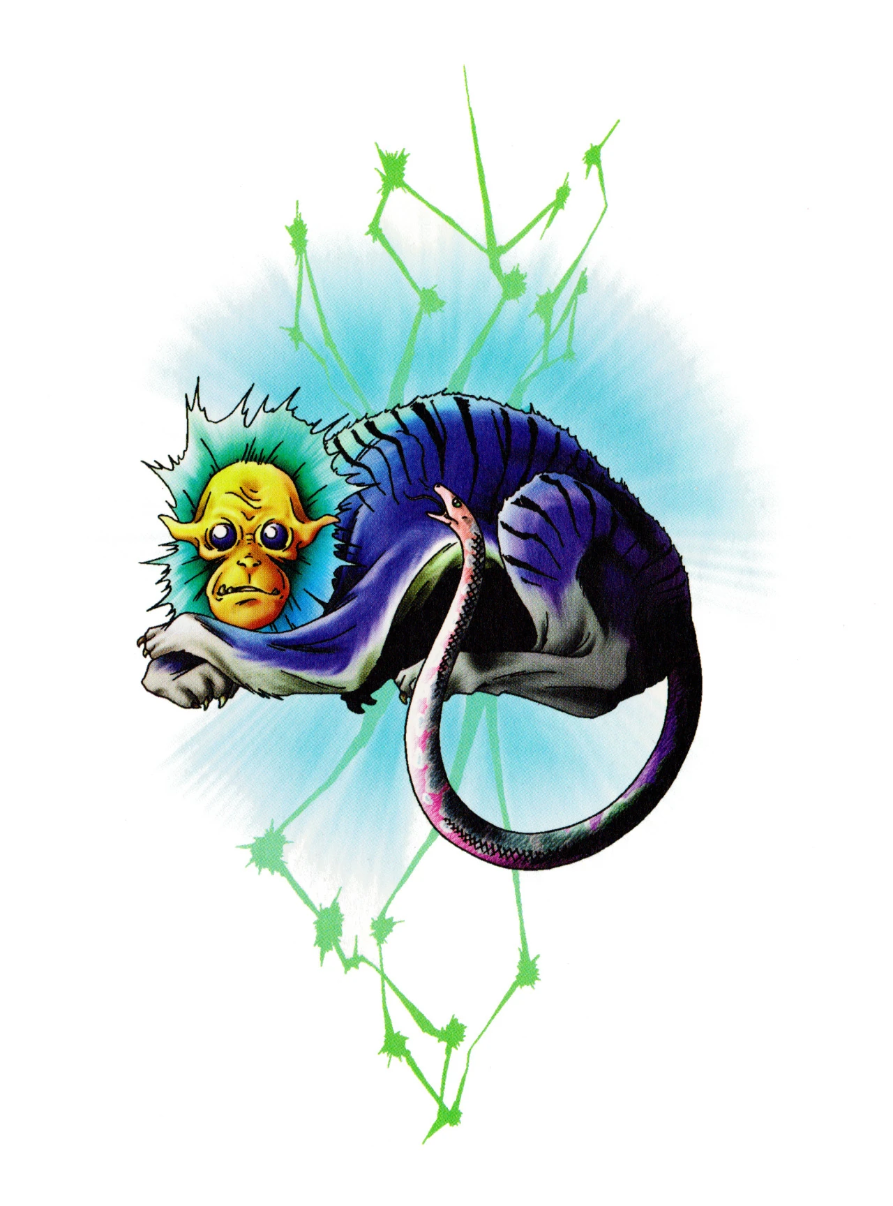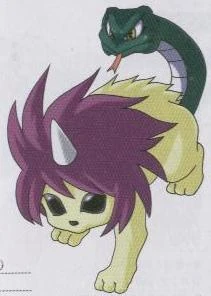 A legendary monster in Japanese mythology, Nue has the head of a monkey, the arms and legs of a tiger, body of a raccoon dog and a snake for a tail.