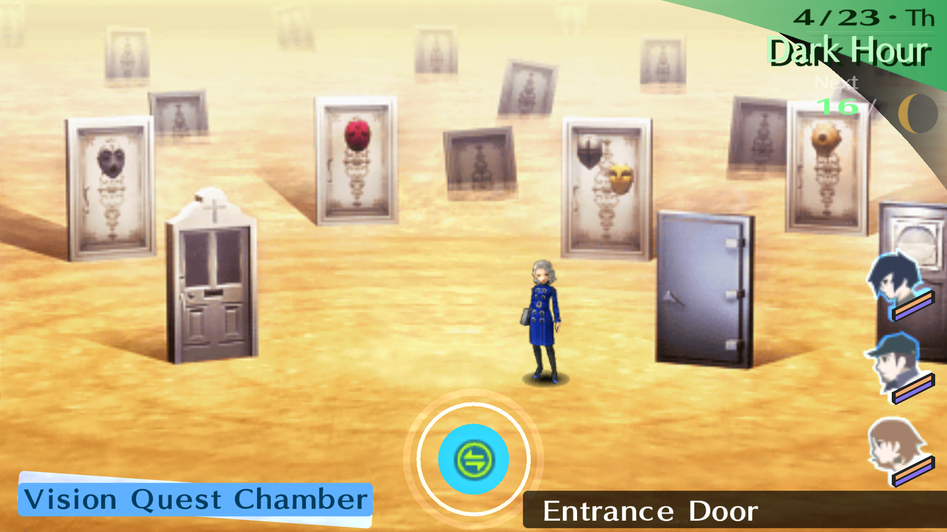 The Desert of Doors from the Abyss of Time seen in The Answer will still appear, however, in an extra feature known as the Vision Quest. In this mode, the party can fight stronger incarnations of the Full Moon shadow bosses — save for Arcana Magician — and partake in special battles that test the party's abilities. When all of the battles have been successfully met, a second optional boss can be fought: Margaret, Igor's assistant in Persona 4 and guardian of the Desert of Doors in P3P. Margaret's challenges become available as soon as the Adamah Block is accessible, and are accessed from a separate door in the Tartarus lobby.