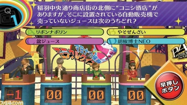 - Midnight Trivia Miracle Quiz - A Quiz show with questions regarding minor aspects of Inaba and the Shadow World. The character dialogue in this content is fully voiced.
