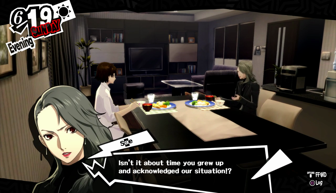 She then can be seen having dinner several time with Makoto. Insistent on her younger sister focusing on her studies, she demands that she doesn't engage in unnecessary things such as the Phantom Thieves. Eventually, Makoto asks her if her dad would support the Phantom Thieves if he were still alive. This question greatly frustrated Sae, and she proceeded to put her down for being ungrateful for her family situation, up until she called Makoto a burden. This greatly distressed Makoto and Sae quickly apologized to her, no longer planning on eating dinner at their home from tomorrow on, causing the two sisters to have a fall out.