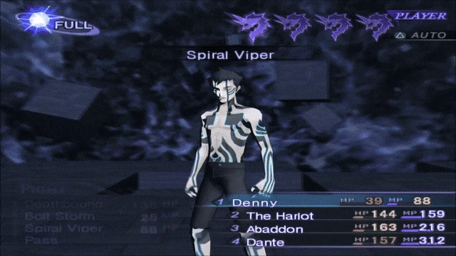 Spiral Viper is deals mega Physical damage to one foe and costs 18% of the caster's HP. It has an accuracy of 97% and a critical rate of 30%. It is exclusive to the Demi-Fiend.