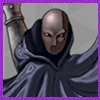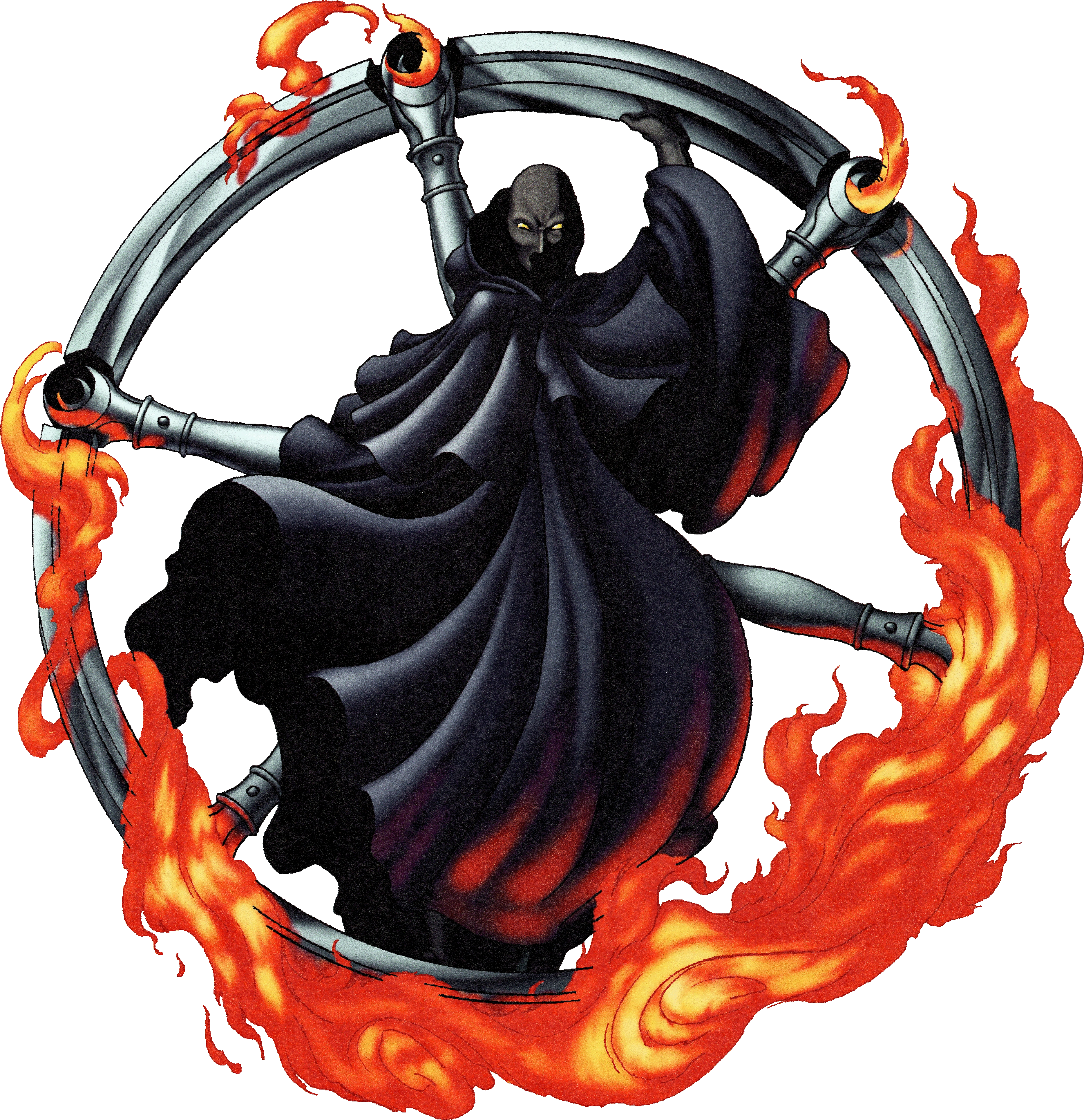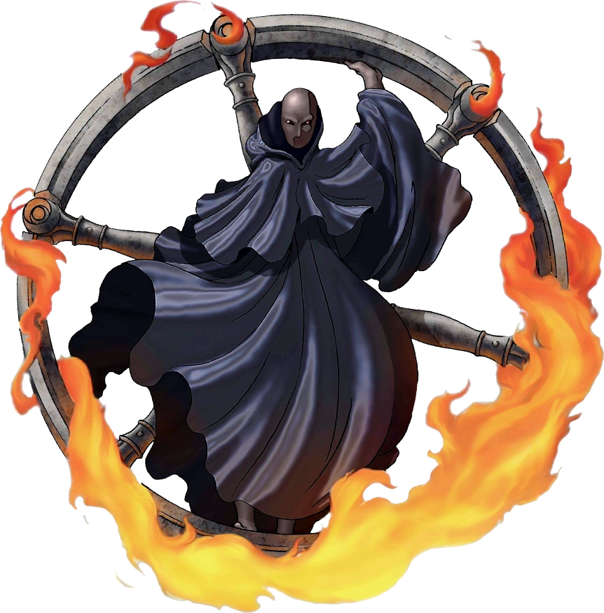 They are clothed in a billowing hooded monk robe complete with a mozzetta and bell sleeve typical of medival clergy. They have burning red eyes set onto a nearly blank brown body. There is barely any definition around the eyes or even a true nose. The body is human and not a dolls' by all appearances. The design was inspired by Cloak of Marvel comics[1] with some notes from The Amazing 3.[2] The exact wheel type, done up here in shinging metal, is unknown but it has some resemblance not only to a chariot wheel but also a chandelier given the flames spinning out of it.