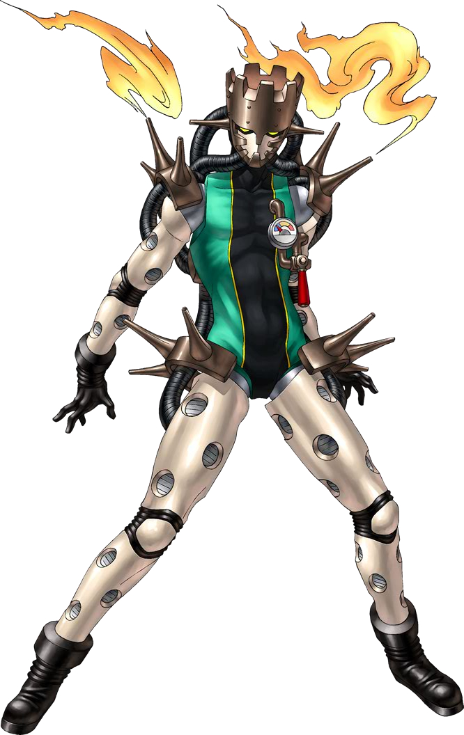Vulcanus is Tatsuya Suou's initial Persona. He appears for the first time in the game after Tatsuya is attacked by Eikichi Mishina in Sumaru Prison. The symbolism for the flames on his shoulder come from the lighter Jun Kurosu gave as a gift to Tatsuya. If Tatsuya has made all the right choices to obtain all the Prime Personas of Rhadamanthus, Eros and Maia, after the Mt. Iwato scenario Philemon will offer Vulcanus Prime for being a potent leader of the group.