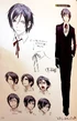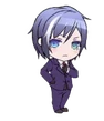 Yashiro is a mature young man with short violet hair with a white streak on his right side, and his eyes are shown to have two different colors (Heterochromia iridum), with his right iris being colored gray while his left iris is colored blue. He wears a dark violet formal suit with white collared shirt, black vest and red ribbon tie, black gloves and dark brown shoes. In addition, he wears a small ear cuff on his left ear.